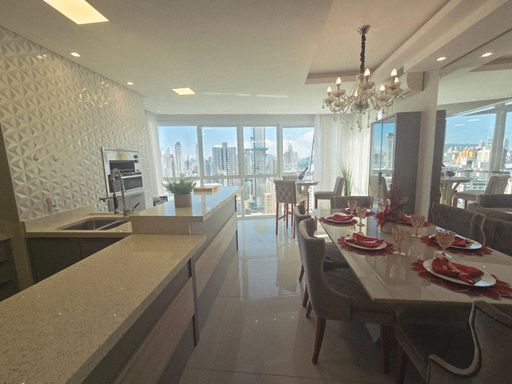 Este apartamento em andar alto une vista livre para o mar e para o skyline da cidade, em um condomínio moderno, com lazer completo estilo resort.